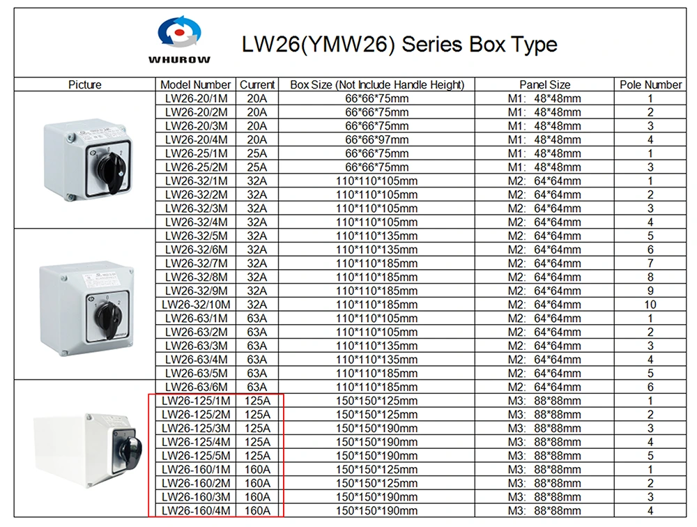 YAMING LW26 125A 160A 방수 박스 캠 스위치는 산업용 전기 제어의 엄격한 요구 사항을 충족하도록 설계된 고성능 3위치 전환 회전 장치입니다. 전기 스위치 생산을 전문으로 하는 선도적인 공장인 Zhejiang Yaming Electric Co., Ltd.에서 개발한 이 스위치는 실용적인 방수 설계와 안정적인 제어 성능을 통합하여 복잡한 환경에서 회로를 연결하거나 분리하기 위한 안정적인 솔루션을 제공합니다. 내부 모델 YMW26-125M 160M은 YAMING의 엄격한 제품 코딩 시스템을 입증하여 생산 공정 전반에 걸쳐 추적성과 품질 관리를 보장합니다.