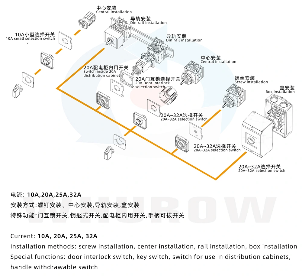 1. 콤팩트한 디자인, 유연한 레이아웃: 25A Z형 DIN 레일 장착 분할형 자물쇠 캠 스위치는 콤팩트한 크기 디자인이 특징으로 제한된 설치 공간에서 유연한 레이아웃이 가능하고 다양한 장비의 내부 구조 설계에 적응하며 설치 편의성이 크게 향상됩니다.